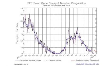 The sun is now headed towards a solar minimum, forecasted to arrive in 2019 as the Sun changes over from Solar Cycle 24 to Solar Cycle 25. The Sun goes through 11-year cycles, during which solar activity increases and decreases.
