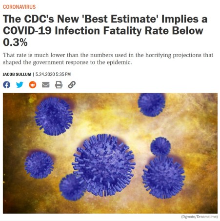 That “best estimate” scenario also assumes that 35 percent of infections are asymptomatic, meaning the total number of infections is more than 50 percent larger than the number of symptomatic cases. It therefore implies that the IFR is between 0.2 percent and 0.3 percent. By contrast, the projections that the CDC made in March, which predicted that as many as 1.7 million Americans could die from COVID-19 without intervention, assumed an IFR of 0.8 percent. Around the same time, researchers at Imperial College produced a worst-case scenario in which 2.2 million Americans died, based on an IFR of 0.9 percent.