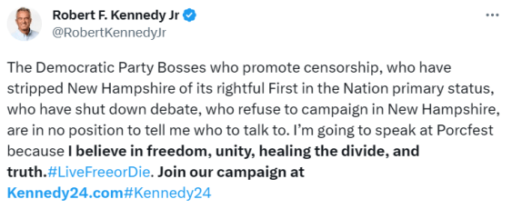 The New Hampshire Democratic Party is very unhappy with Robert F. Kennedy, Jr., because they’ve just learned he’ll be speaking on Thursday, June 22, at PorcFest, the annual gathering sponsored by the libertarian Free State Project.