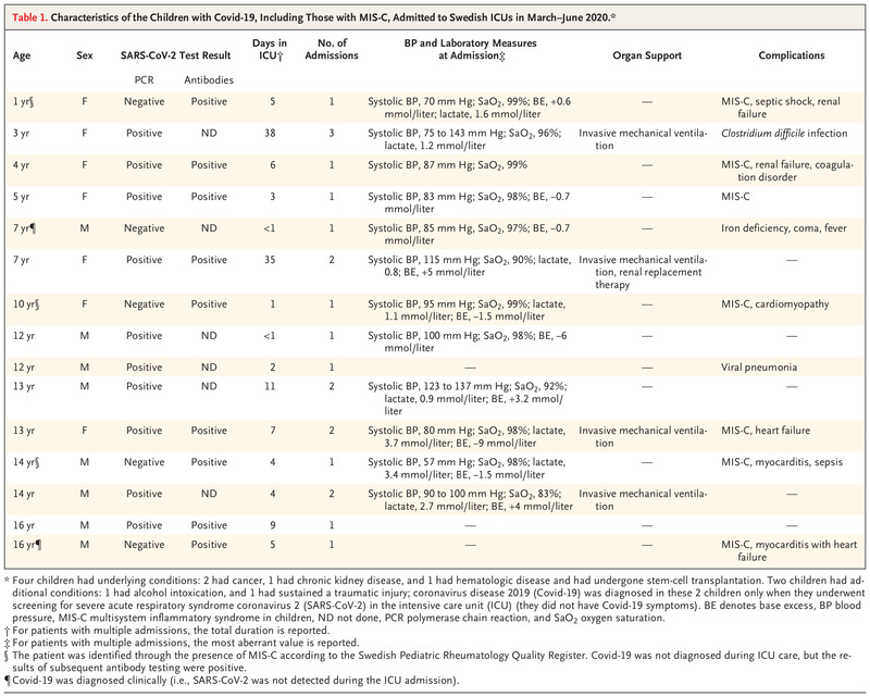 Data on severe Covid-19, as defined by intensive care unit (ICU) admission, were prospectively recorded in the nationwide Swedish intensive care registry. We followed all children who were admitted to an ICU between March 1 and June 30, 2020 (school ended around June 10) with laboratory-verified or clinically verified Covid-19, including patients who were admitted for multisystem inflammatory syndrome in children (MIS-C, which is likely to be related to Covid-19)4 according to the Swedish Pediatric Rheumatology Quality Register. (More information on the registry and a link to the Word Health Organization scientific brief on MIS-C are provided in the Supplementary Appendix, available with the full text of this letter at NEJM.org.) The Stockholm Ethics Review Board approved the study. Informed consent was waived by the review board.